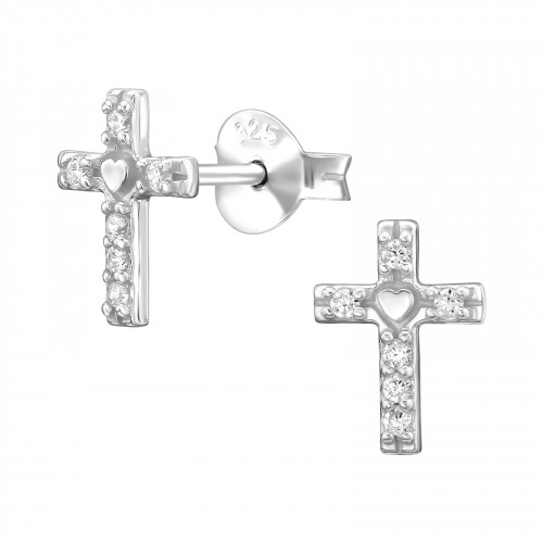 Cross And Heart - 925 Sterling Silver Stud Earrings with CZ SD50299